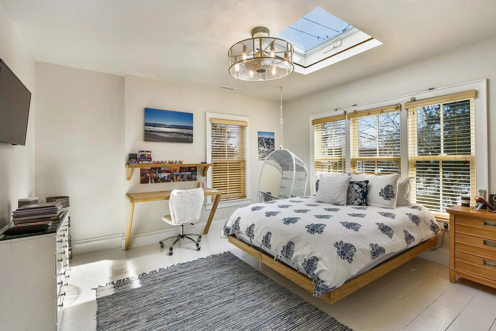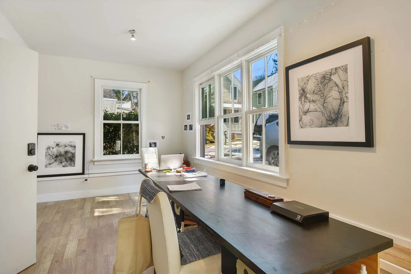 A bright, adaptable workspace with oversized windows and gallery-ready walls—perfect for drawing, digital work, or meeting clients in a sunlit Sag Harbor setting.